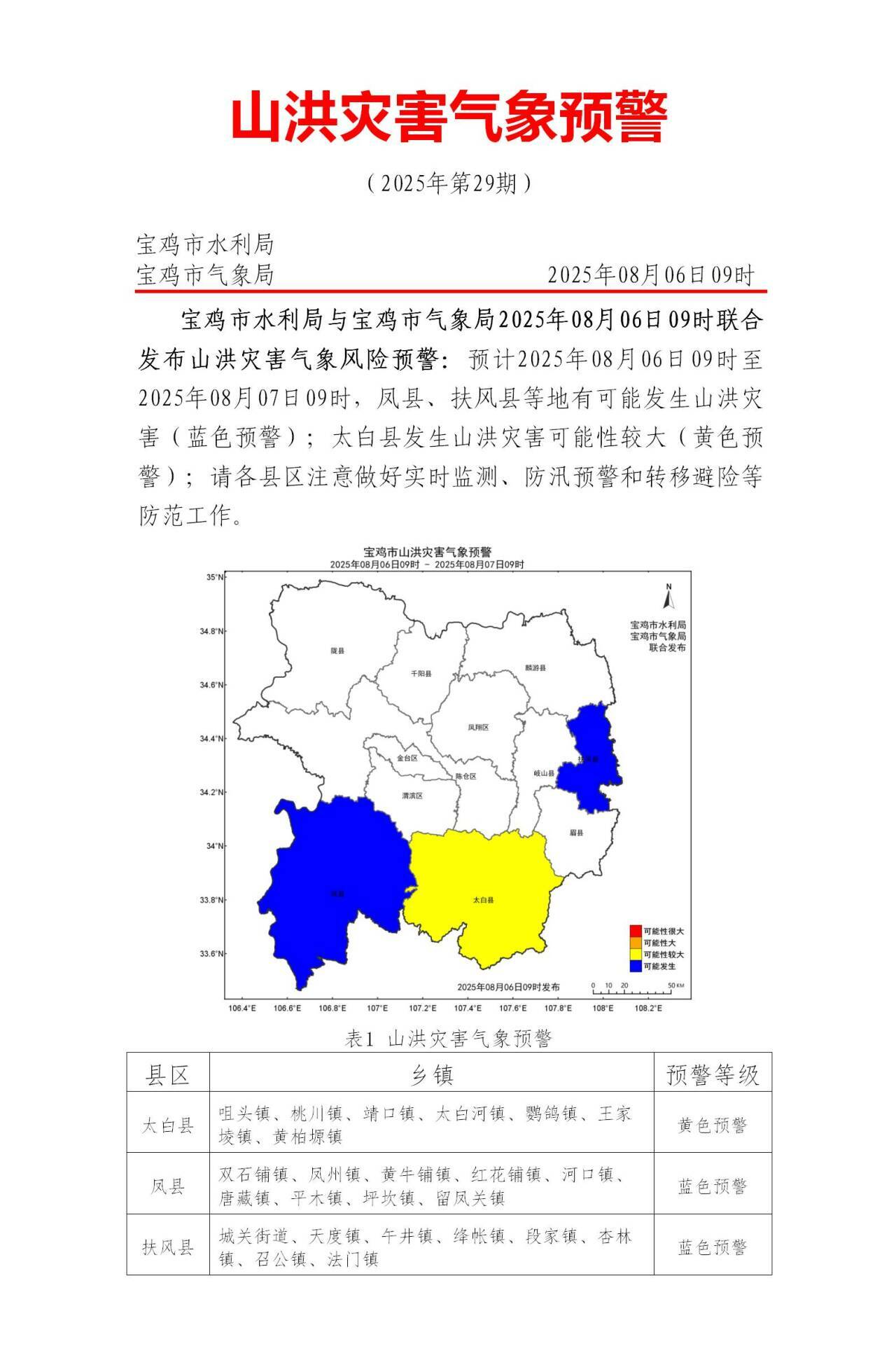 【宝鸡市气象局】宝鸡市水利局与宝鸡市气象局2025年08月06日09时联合发布山洪灾害气象风险预警:预计2025年08月06日09时至2025年08月07日09时,凤县、扶风县等地有可能发生山洪灾害(蓝色预警);太白县发生山洪灾害可能性较大(黄色预警);请各县区注意做好实时监测、防汛预警和转移避险等防范工作。