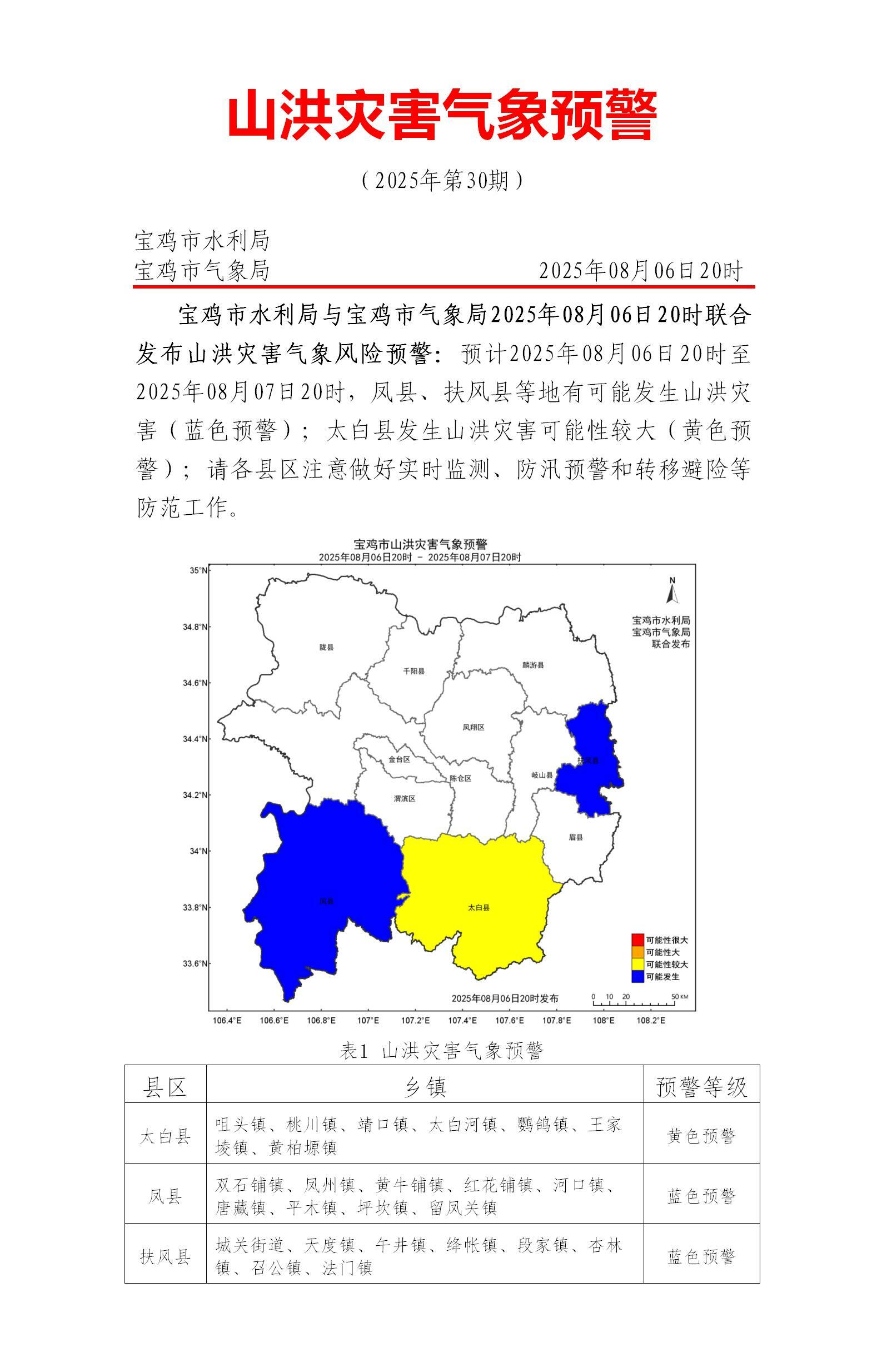 【宝鸡市气象局】宝鸡市水利局与宝鸡市气象局2025年08月06日20时联合发布山洪灾害气象风险预警:预计2025年08月06日20时至2025年08月07日20时,凤县、扶风县等地有可能发生山洪灾害(蓝色预警);太白县发生山洪灾害可能性较大(黄色预警);请各县区注意做好实时监测、防汛预警和转移避险等防范工作。