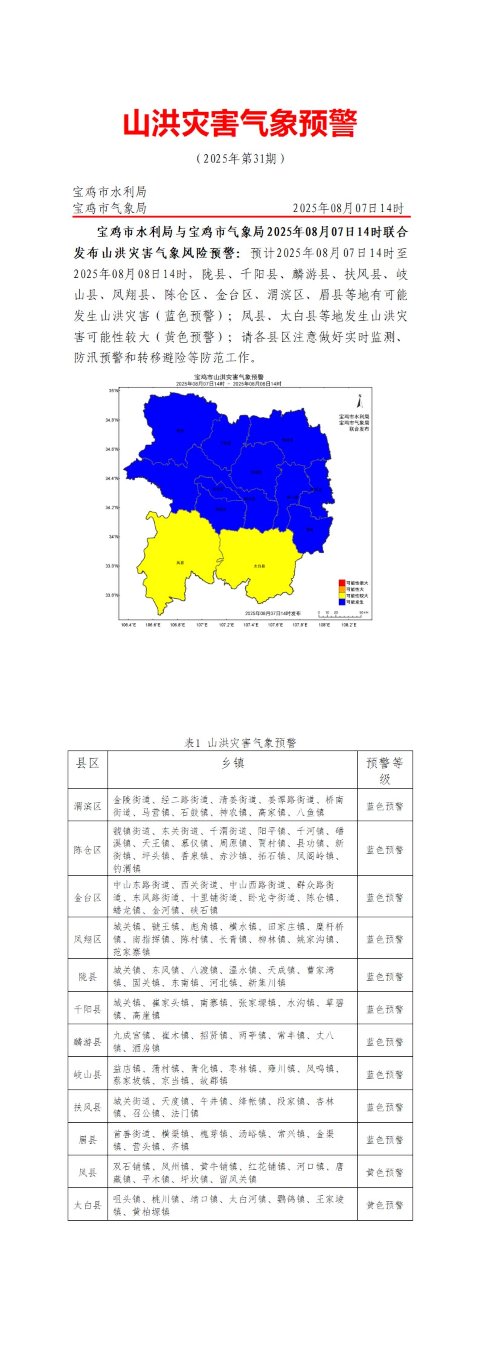 【宝鸡市气象局】宝鸡市水利局与宝鸡市气象局2025年08月07日14时联合发布山洪灾害气象风险预警:预计2025年08月07日14时至2025年08月08日14时,陇县、千阳县、游县、扶风县、岐山县、凤翔县、陈仓区、金台区、渭滨区、眉县等地有可能发生山洪灾害(蓝色预警);凤县、太白县等地发生山洪灾害可能性较大(黄色预警);请各县区注意做好实时监测、防汛预警和转移避险等防范工作。