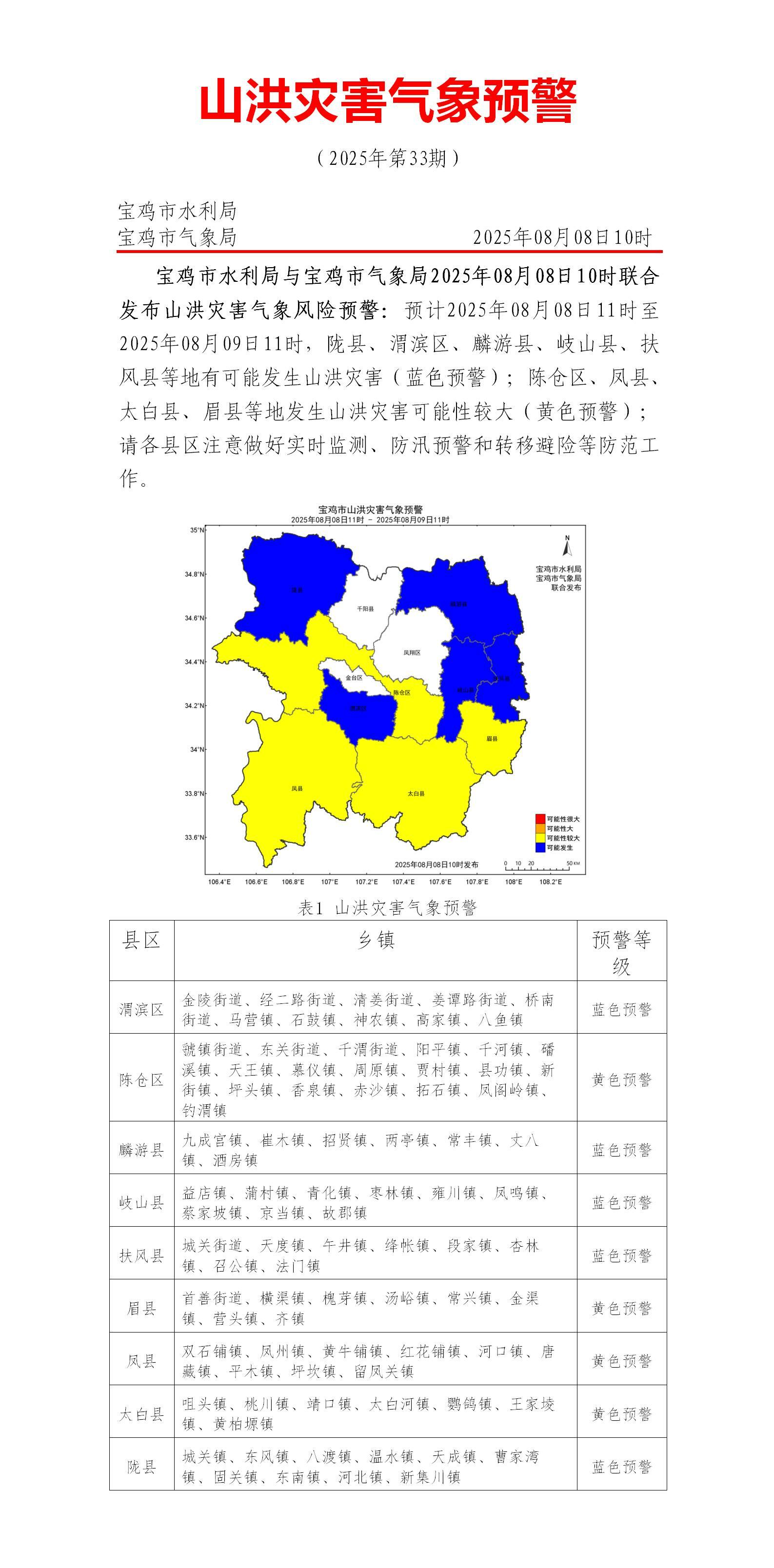 宝鸡市水利局与宝鸡市气象局2025年08月08日10时联合发布山洪灾害气象风险预警:预计2025年08月08日11时至2025年08月09日11时,陇县、渭滨区、麟游县、岐山县、扶风县等地有可能发生山洪灾害(蓝色预警);陈仓区、凤县、太白县、眉县等地发生山洪灾害可能性较大(黄色预警);请各县区注意做好实时监测、防汛预警和转移避险等防范工作。