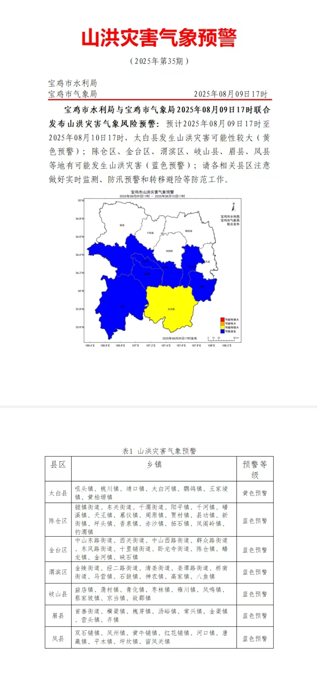 【宝鸡市气象局】宝鸡市水利局与宝鸡市气象局2025年08月09日17时联合发布山洪灾害气象风险预警:预计2025年08月09日17时至2025年08月10日17时,太白县发生山洪灾害可能性较大(黄色预警);陈仓区、金台区、渭滨区、岐山县、眉县、凤县等地有可能发生山洪灾害(蓝色预警);请各相关县区注意做好实时监测、防汛预警和转移避险等防范工作。
