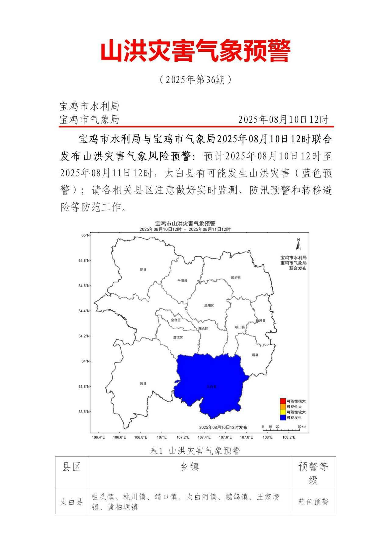 宝鸡市水利局与宝鸡市气象局2025年08月10日12时联合发布山洪灾害气象风险预警:预计2025年08月10日12时至2025年08月11日12时,太白县有可能发生山洪灾害(蓝色预警);请各相关县区注意做好实时监测、防汛预警和转移避险等防范工作。