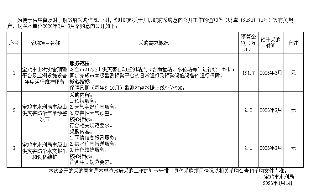 宝鸡市水利局2026年01月至2026年03月政府采购意向