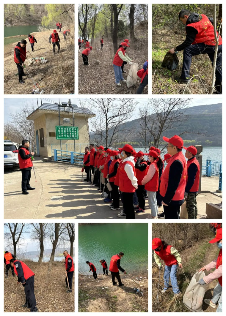 活动中,大家身穿红马甲,带着编织袋、钳子、铁锨等工具,开展了清洁库区垃圾行动。他们有的穿荆棘,有的爬陡坡,不畏艰险捡对库边的烟头、纸屑、塑料袋、白色垃圾等进行了清理;大家不怕脏、不怕累,相互协作,个个争先恐后,干劲十足,通过一天的辛勤劳动为水源地“美颜”,生动诠释了生态优先,绿色发展的环保理念。