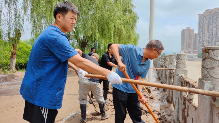 近日,我市受强降雨影响,致清姜河水暴涨,洪水漫过河堤使园区道路大面积淤积,淤泥、垃圾、枯枝败叶铺满整个道路,7月18日,洪水退去后,市拦河闸管理中心组织全体党员、职工、志愿者共计40余人,投入到清淤自救工作中。